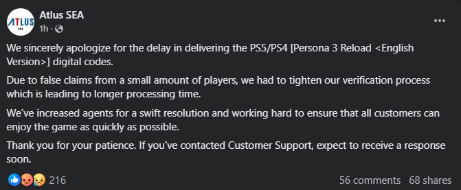Menanggapi situasi ini, Atlus Southeast Asia segera memberikan klarifikasi mengenai pemalsuan klaim kode digital. Atlus menyatakan bahwa mereka akan memperketat proses verifikasi kode digital guna mencegah kasus serupa di masa depan.