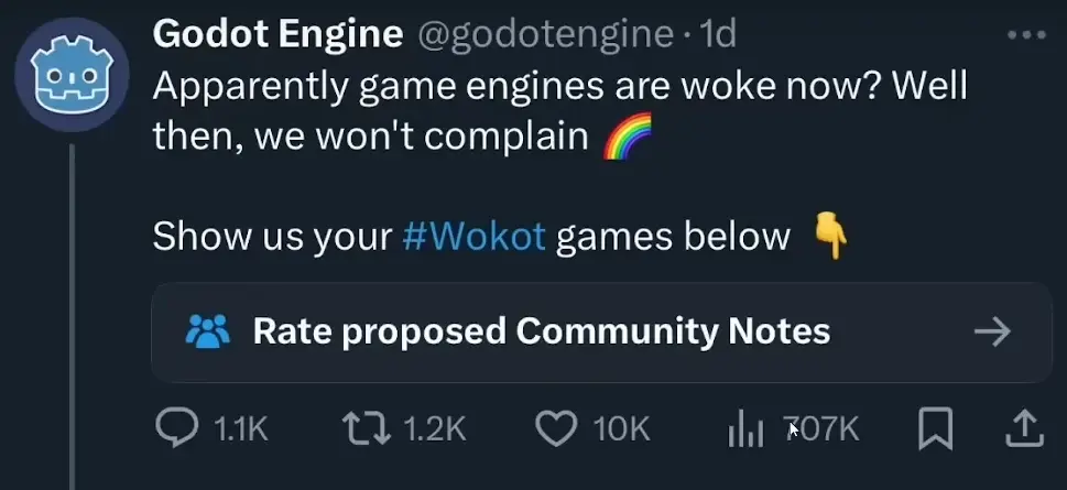 Pada akun X resmi @GodotEngine, Community Manager Godot menulis, “Rupanya mesin permainan sudah mulai woke sekarang? Kalau begitu, kami tidak akan mengeluh. Tunjukkan permainan #wokot Anda di bawah ini.” Tweet ini memicu reaksi keras dari beberapa pengembang gim yang merasa tersinggung dengan penggunaan istilah “woke” dalam konteks tersebut.